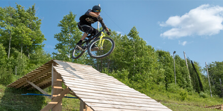 The Smugglers’ Notch Mountain Bike Center has it all! Situated on over three acres, the park features a flat ground skills park, a pump track, and a downhill skills park. The downhill skills park is accessed by a Wonder Carpet conveyor lift, which runs daily. Our mountain bike trail network features over 5 miles of single track and 8 miles of double track mountain biking!