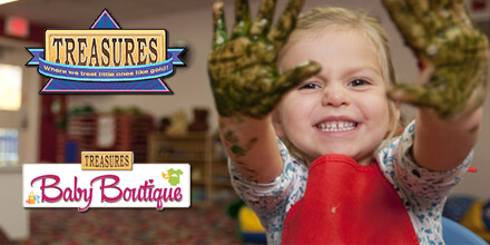 TREASURES has some very special features for both kids and parents including air conditioning, giant fish tanks in every room, a multitude of age-appropriate toys, tiny toilets and small sinks, 5,400 square feet of indoor space, over 4,000 square feet of outdoor playground, one-way mirror viewing for parents, and easy drop-off and pick-up.